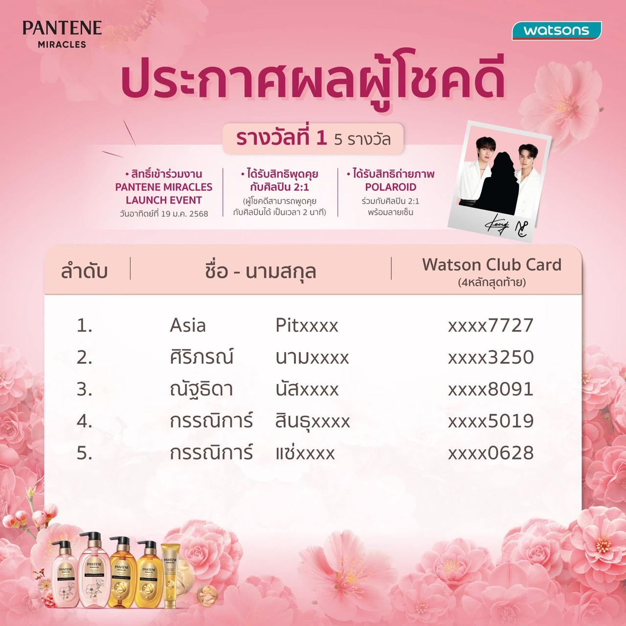 ประกาศรายชื่อผู้โชคดี 30 ท่าน จากกิจกรรม Pantene Miracles x Keng Namping✨